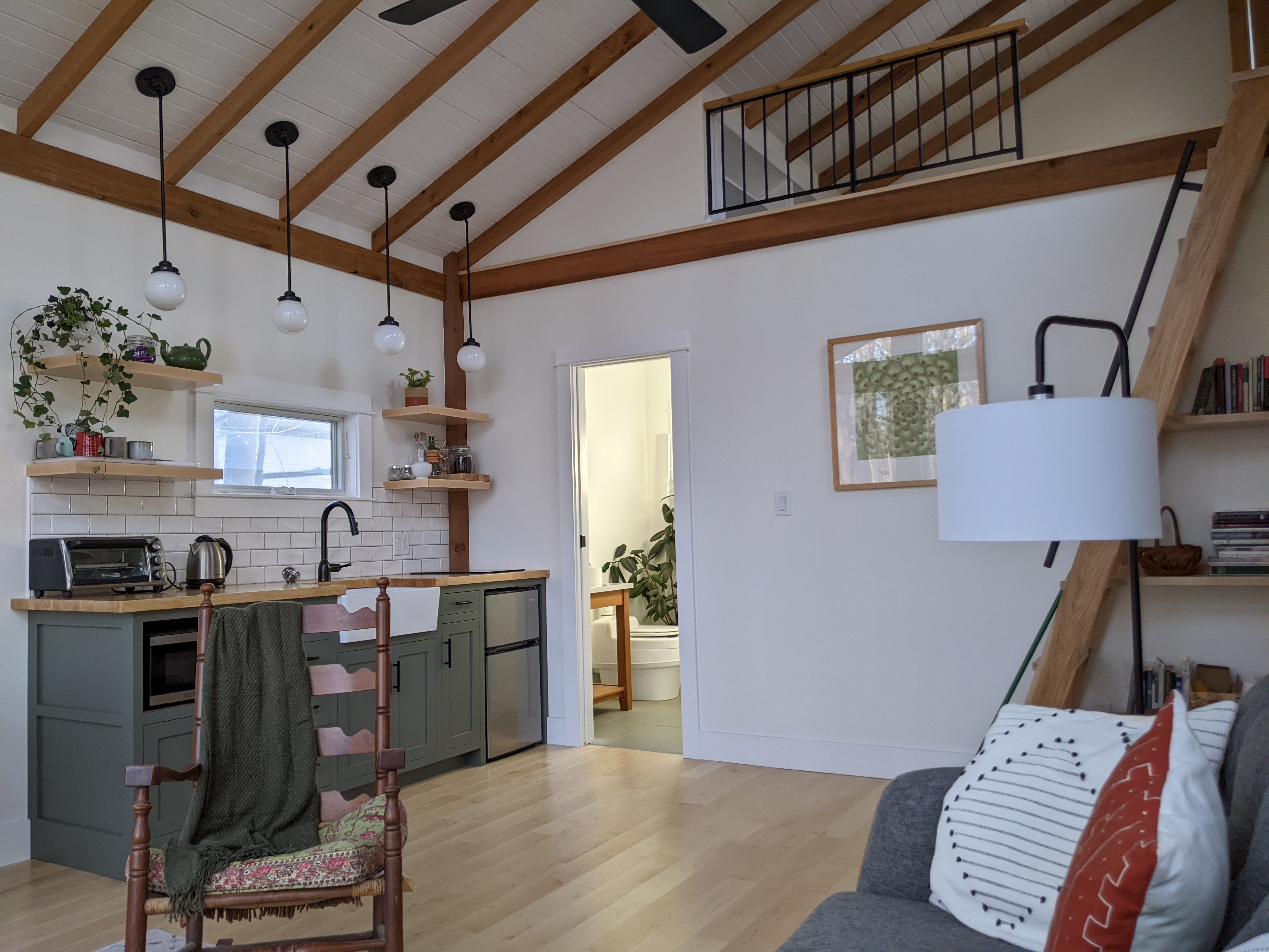 The Anchorhold is equipped with a comfortable seating area, a dining table/ desk, a mini kitchen, a sleeping loft, and a half bath (with a sink and composting toilet). It can sleep up to four adults, but is not a suitable space for long term stays, largely because it relies on an off-grid water system. It does NOT have reliable internet access.